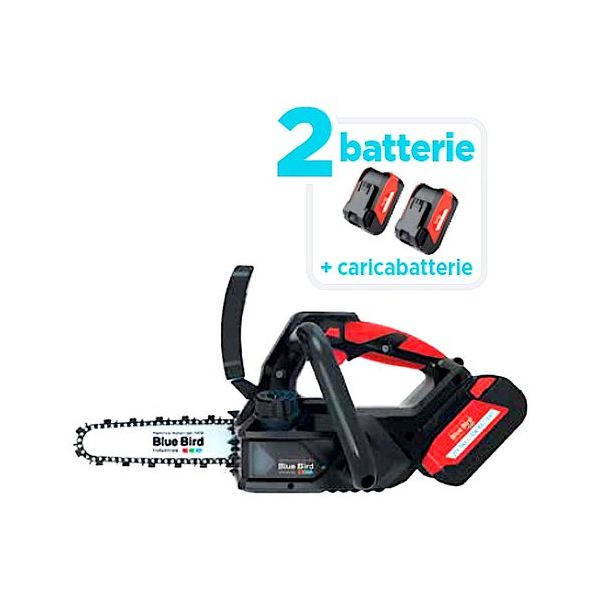 Ideale per la potatura. Motore elettrico a batteria. Alimentazione con batteria 21 volt 5,0 Ah inclusa. Lunghezza barra 17 Centimetri. Passo catena 1/4 - 1,1 mm. Tensionamento catena manuale con vite laterale