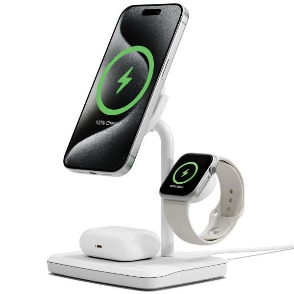 ChargeBase Base di ricarica 3 in 1 Qi2 per iphone 16 e precedenti per Apple Watch e per Airpods Bianco
